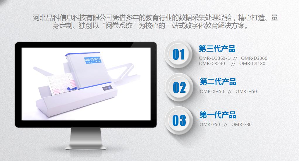 河北品科信息科技有限公司,是集生產(chǎn)、研發(fā)和銷售為一體的高科技企業(yè),目前主要從事考試光標(biāo)閱讀機(jī)(簡(jiǎn)稱OMR:Optical Mark Reader)、教學(xué)觸控一體機(jī)、網(wǎng)上閱卷系統(tǒng)和考試答題卡及其相關(guān)產(chǎn)品(機(jī)讀卡、軟件)的開發(fā)生產(chǎn)和銷售。 公司自成立以來,依托雄厚的技術(shù)實(shí)力和研發(fā)背景,和佳能、松下等國際硬件廠商合作,一直致力于自有知識(shí)產(chǎn)權(quán)軟硬件的產(chǎn)品的研制和開發(fā),在數(shù)據(jù)處理產(chǎn)品領(lǐng)域(OMR)推出了一系列具有國內(nèi)外水平的產(chǎn)品,已擁有三個(gè)系列的光標(biāo)閱機(jī)產(chǎn)品,為廣大用戶提供而完善的解決方案,可靠而安全的系統(tǒng)集成,優(yōu)質(zhì)而周到的技術(shù)服務(wù),應(yīng)用范圍覆蓋了教育、郵電、通訊、金融、證券、稅務(wù)、統(tǒng)計(jì)等諸多領(lǐng)域,產(chǎn)品遠(yuǎn)銷海內(nèi)外多個(gè)國家和地區(qū)。